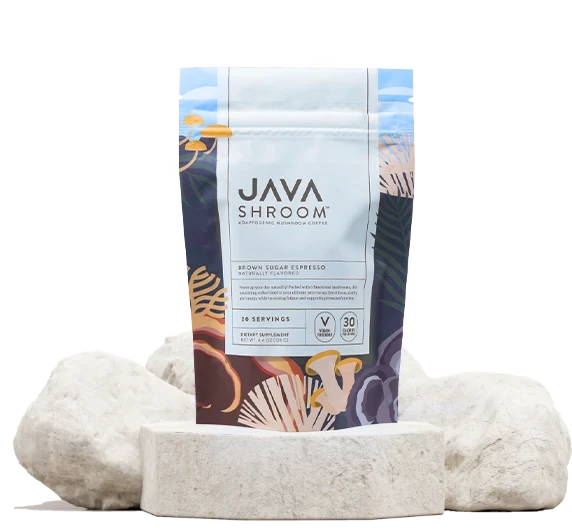- In a tall cocktail shaker, add Java Shroom™, warm water, caramel syrup, milk and ice.